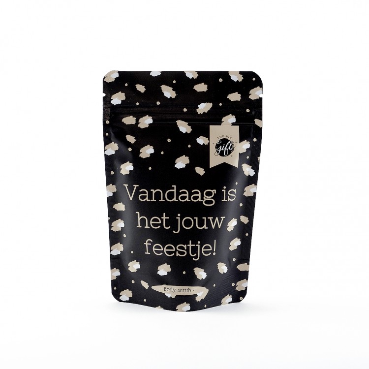 Bodyscrub – Vandaag Is Jouw Feestje is gemaakt van natuurlijke ingrediënten. En is ontworpen om je huid op milde wijze te exfoliëren. Door de scrub over de huid te wrijven, worden de dode huidcellen verwijderd. Hierdoor zal de huid zacht en glad aanvoelen. De bodyscrub bevat geen schadelijke stoffen en is geschikt voor alle huidtypes.