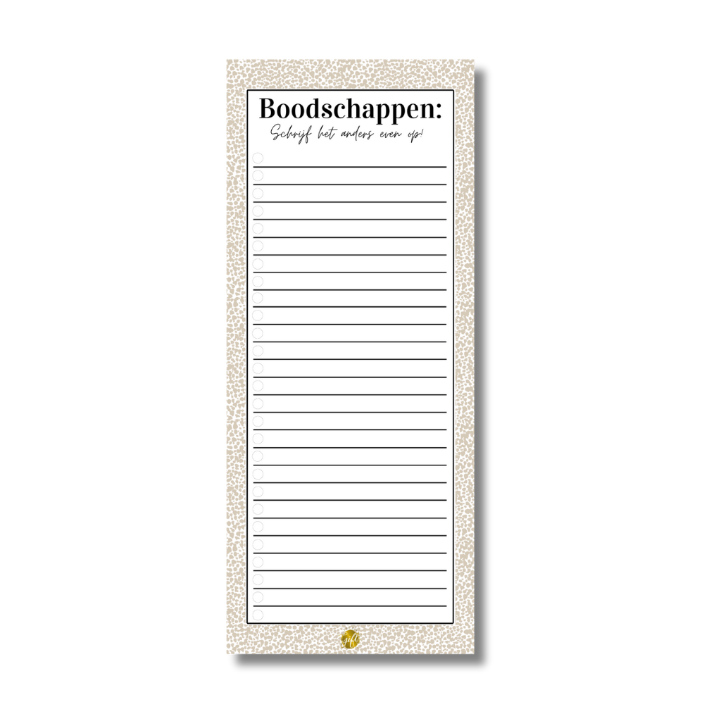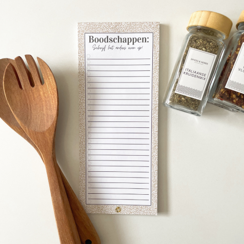 Met het Notitieblok – Boodschappenlijst vergeet je nooit meer iets tijdens het winkelen. Dit praktische notitieblok is speciaal ontworpen om al je boodschappen overzichtelijk op een rijtje te zetten. Het slanke formaat van 10 x 24 cm maakt het gemakkelijk om dit boodschappenlijstje mee te nemen in je tas of keukenlade, zodat je het altijd bij de hand hebt.