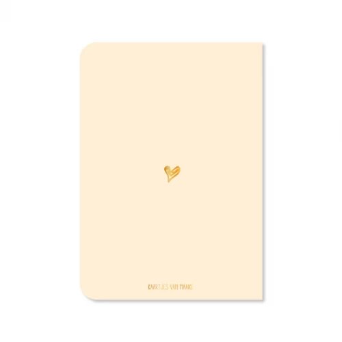 Papier: 300 grams (warm wit) papier met een matte uitstraling, afgewerkt met goudfolie en aan de buitenzijden afgewerkt met ronde hoekjes