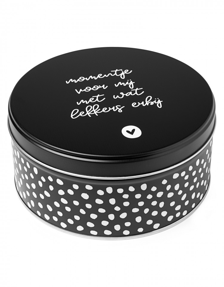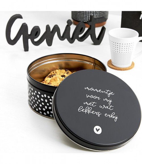 Koffie (of thee) met een koekje wordt een feestje met deze leuke koektrommel van Zoedt. Deze trommel hoort niet in de kast, maar verdient een mooi plekje in de keuken of op tafel. De koektrommel heeft een mooie mat zwarte uitstraling en heeft aan de zijkant een stippen patroon. Bovenop de trommel staat de tekst 'Momentje voor mij met wat lekkers erbij'. Cadeautip: vul deze koektrommel en geef hem cadeau!