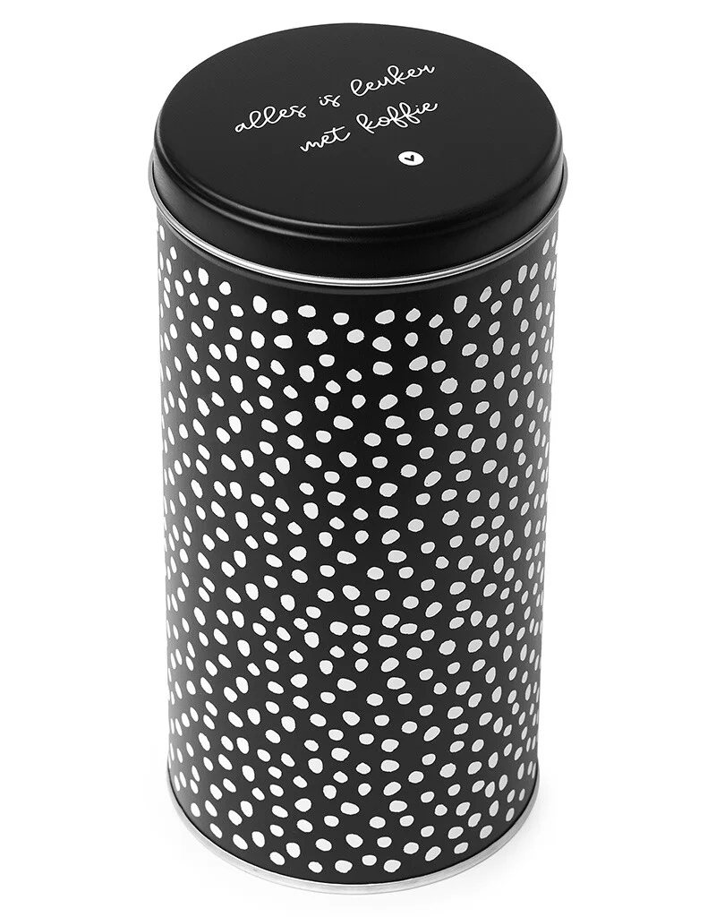 Een echte koffieliefhebber? Dan mag dit koffieblik van Zoedt bij jou in de kast niet ontbreken. En hij is zo leuk, dat hij eigenlijk niet in de kast hoort, maar verdient een mooie plekje bij jou koffiehoekje op tafel of het aanrecht. Het koffieblik heeft een mooie mat zwarte uitstraling en heeft aan de zijkant een stippen patroon. Bovenop de trommel staat een hartje. Cadeautip: vul het koffieblik met koffiebonen, koffiepads of cups en geef het cadeau!