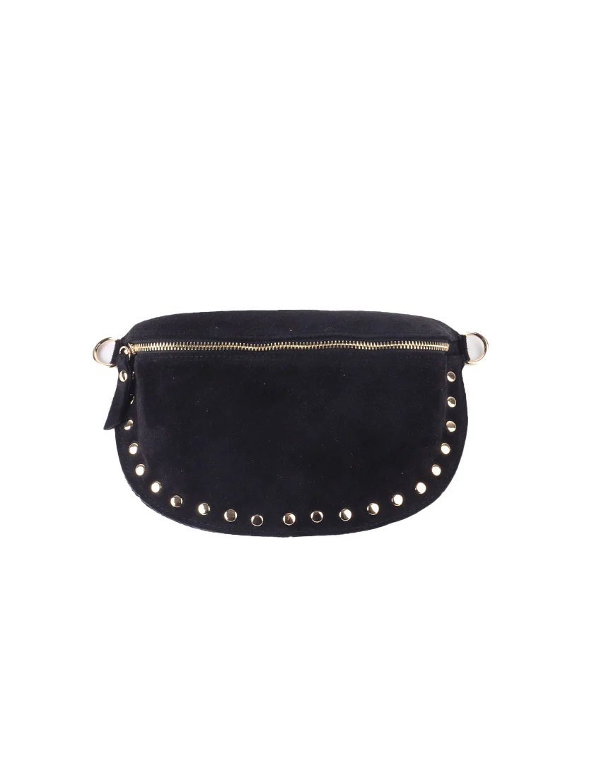 Elegante suède schoudertas met goudkleurige studs. Compact, stijlvol en perfect voor elke dag.